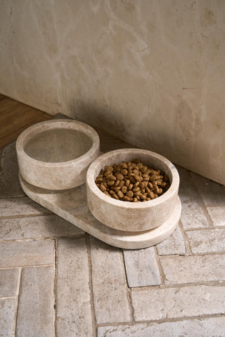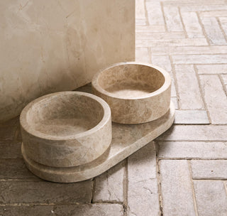 Delicately crafted from Light Emperador Marble—an exquisite stone featuring soft, beige tones and intricate veining—this set includes two beautifully designed bowls and a matching tray.