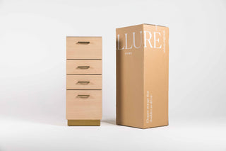 Consciously crafted using the finest white oak wood and a natural Calacatta Gold Quartz quartz finish, The Bella features authentic Italian leather beauty compartments and built-in power outlets for your hair tools. The dropdown top shelf offers a convenient surface to place anything you may need for efficiency and ease during your beauty routine.